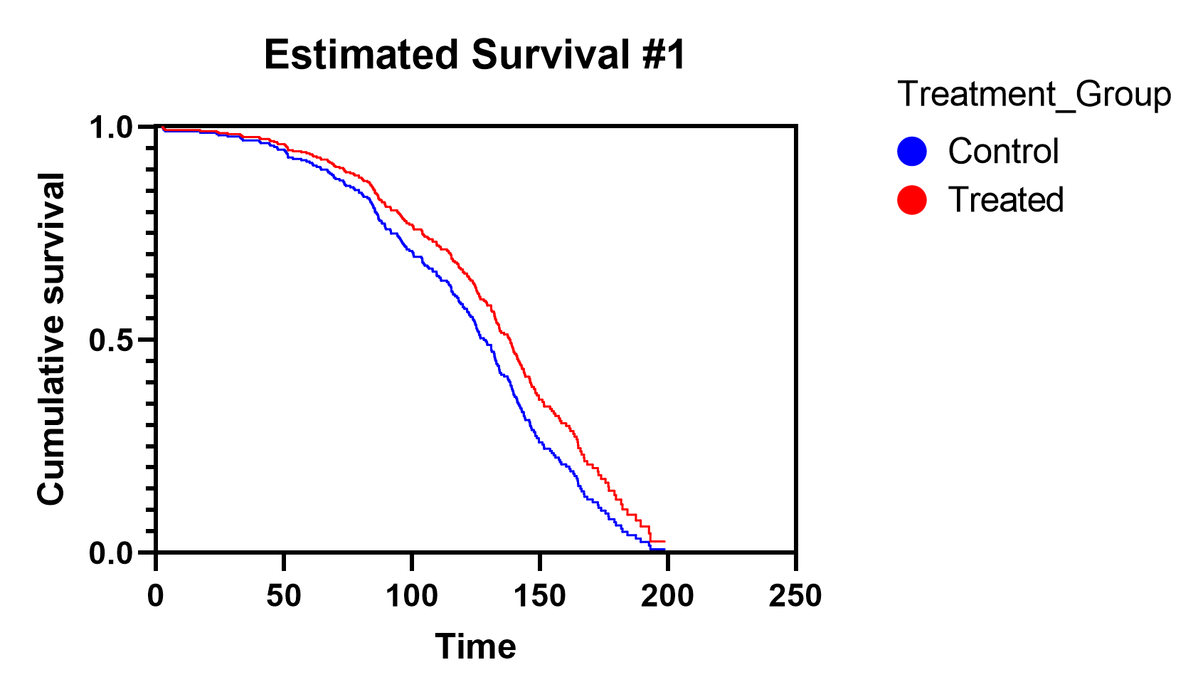 From these graphs we can see that the "Treatment_Group" and "Sex" variables both seem to have a fairly substantial impact on estimated survival, while the effect of "Age" is rather small. For example, the difference between the survival curves in Graph 1 (Treatment_Group) are much more separated than the survival curves in Graph 2 (Age). And in the third graph, we see that there is a notable difference between the curves for "Control : Female" and "Treated : Female", between "Control : Male" and "Treated : Male", between "Control : Female" and "Control : Male", and between "Treated : Female" and "Treated : Male" (Note that on this graph, the curves for "Control : Female" and "Treated : Male" are nearly overlapping so that at first glance it may appear that there are only three curves on this graph).