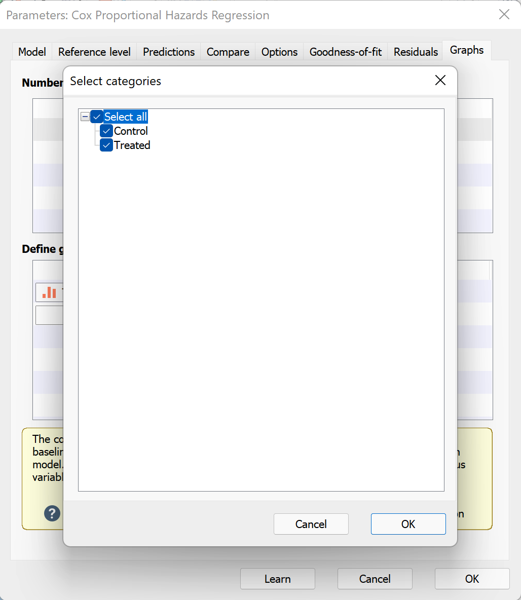 When a graph is added, there is an option to include the baseline survival curve on each graph. This is the same curve that is reported on the “Baseline functions” results sheet. We won’t enable this option for this example. Selecting each of the graphs in the upper box, we can then specify the variables that we’d like to include on each in the “Define groups to generate curves for” section below. With “Estimated Survival #1” selected in the upper box of the dialog, we’ll use the dropdown menu in the lower box of the dialog to select the “Treatment_Group” variable. By default, all levels of a categorical variable are included when the variable is selected. To confirm that we have both the “Control” and “Treatment” levels selected, we can click the “Select” button to see a list of all levels available for the specified variable.