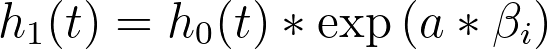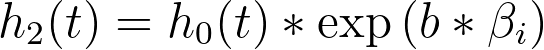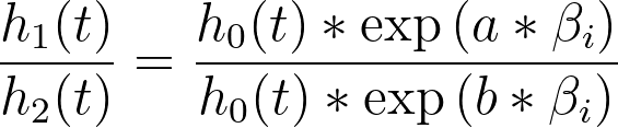 Another very interesting result of this assumption of a baseline hazard function is what happens when we consider the hazard for two individuals with different values of predictor variables. To keep it simple, let’s consider a model with a single predictor variable (xi), in which one individual has a value of “a” for this variable, and the second individual has a value of “b” for this variable. The hazard functions for these two individuals would be: