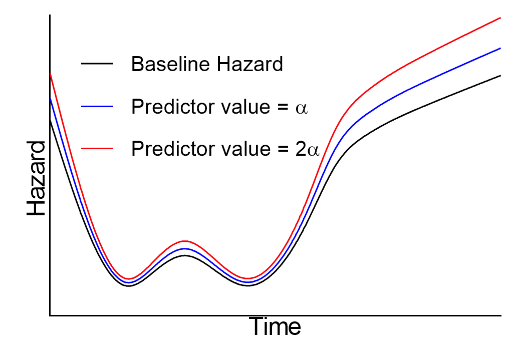 The baseline hazard in the numerator and denominator cancel, leaving a fraction that is constant with respect to time (we assume that the values of predictor variables don’t change over time). In other words, the hazard ratio for any two individuals in a population is constant at all times. Yet another way to say this, is that the hazards for two individuals in the population are always proportional to each other. This concept of proportionality is what gives this analysis its name: Cox proportional hazards regression. The following graph gives a graphical example of these proportional relationships: the black curve is a theoretical baseline hazard rate, while the blue and red curves represent hazard rates corresponding to two different values of a single predictor variable (some arbitrary value “α” for the blue curve, and double that value “2α” for the red curve):