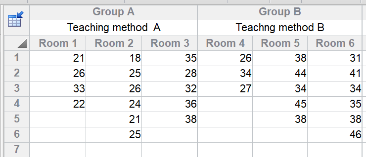 This is the tutorial data provided with Prism for the nested t test. You are comparing two teaching methods (data set columns), each used in three rooms (subcolumns), with an outcome measured in between 4-6 students per rooms (rows).