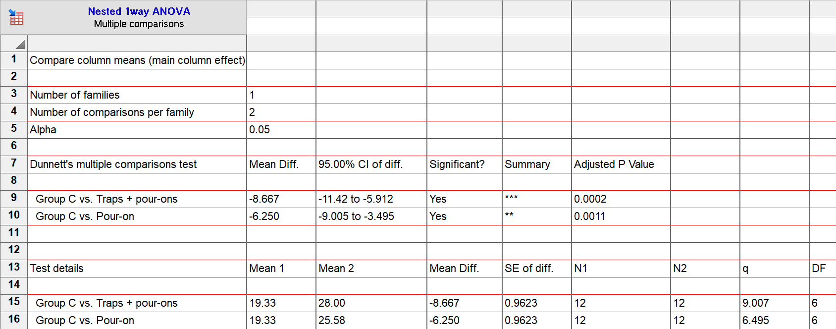 Nested ANOVA. This P value tests the null hypothesis that the three columns (treatments in this example) are the same on average.