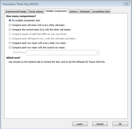 In many cases, the answers you really want are determined by multiple comparisons and not by the overall ANOVA analysis. Choose the comparisons you want to make on this tab, and then set the details on the next (Options) tab.