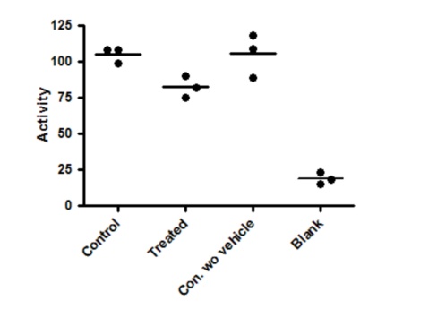 In the graph below, the first column shows control data, and the second column shows data following a treatment. The goal of the experiment is to see if the treatment changes the measured activity (shown on the Y axis). To make sure the vehicle (solvent used to dissolve the treatment) isn't influencing the result, the experiment was performed with another control that lacked the vehicle (third column). To make sure the experiment is working properly, nonspecific (blank) data were collected and displayed in the fourth column.