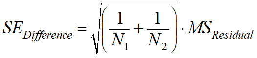 First compute the standard error of the difference between groups 1 and 2. This is computed as follows, where N1 and N2 are the sample sizes of the two groups being compared (both equal to 3 for this example) and MSresidual is the residual mean square reported by the one-way ANOVA (80.0 in this example):