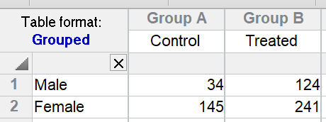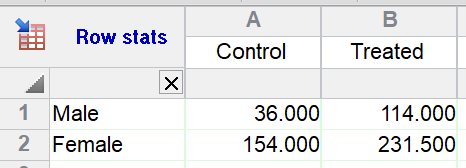 The two values in side-by-side subcolumns are results from different animals. There are eight values so eight animals. Prism tests whether the effect of the treatment is the same in both genders -- whether there is an interaction. The P value for this example is quite high, so there is no evidence of interaction. The ANOVA table (not shown here) shows that Prism is able to separately compute the sum-of-squares for interaction and the sum-of-squares between replicate animals (residual variation).