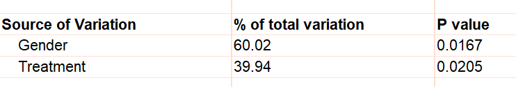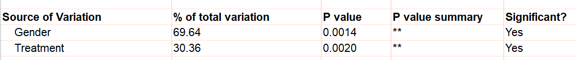 For example, the two values for treated females could be large because that one animal is a bit different than the others, quite apart from the effect of treatment. So the results only make sense if you assume that the variation seen in the duplicate measurements is the same as the variation between animals. Be aware, however, that when your experiment contains pseudo-replicates, this assumption often is not valid.