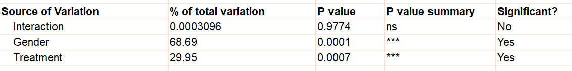 If you only have one value for each row/column cell, Prism cannot test for interaction so assumes there is none. For the example, this assumption is that the effect of treatment is the same in males and females. The P values are tiny for both the effects of Gender and the effect of Treatment.