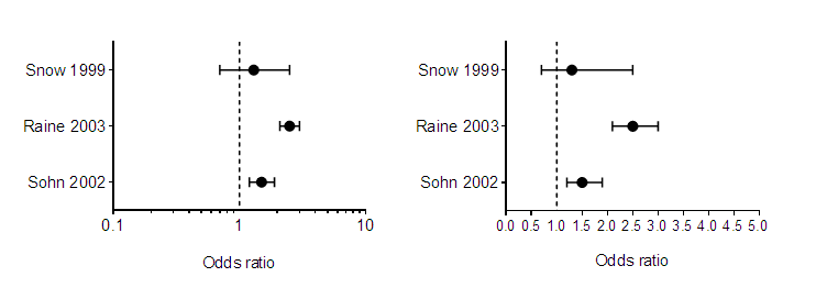 On a log scale, in contrast, ratios are symmetrical. A ratio of 1.0 (no change) is halfway between a ratio of 0.5 (half the risk) and a ratio of 2.0 (twice the risk). Thus, plotting ratios on a log scale (as shown below) makes them easier to interpret. The graph below plots odds ratios from three case‐control retrospective studies, but any ratio can benefit from being plotted on a log axis.