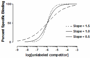 •HillSlope describes the steepness of the curve. This variable is called the Hill slope, the slope factor, or the Hill coefficient. If it is positive, the curve increases as X increases. If it is negative, the curve decreases as X increases. A standard sigmoid dose-response curve (previous equation) has a Hill Slope of 1.0. When HillSlope is less than 1.0, the curve is more shallow. When HillSlope is greater than 1.0, the curve is steeper. The Hill slope has no units.