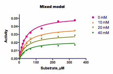 The graph above shows the sample data for competitive enzyme kinetics, and shows how to fit a family of curves. Here, each curve shows enzyme activity as a function of substrate concentration. The curves differ by the presence of various amounts of an inhibitor. There are, essentially, two independent variables: substrate concentration, and inhibitor concentration.