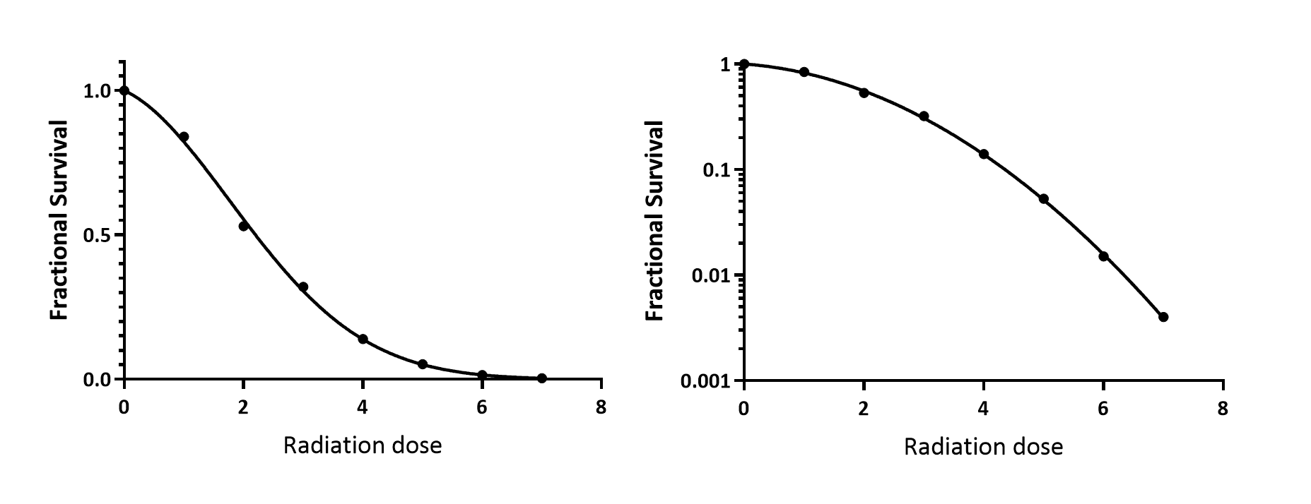 The graph on the left below uses a linear Y axis. The graph on the right uses a logarithmic Y axis. This was done in GraphPad Prism by making the change in the Format Axis dialog. The nonlinear regression "saw" the original data where the Y values were fractions (not logarithm of fractions; that would require a modified model).