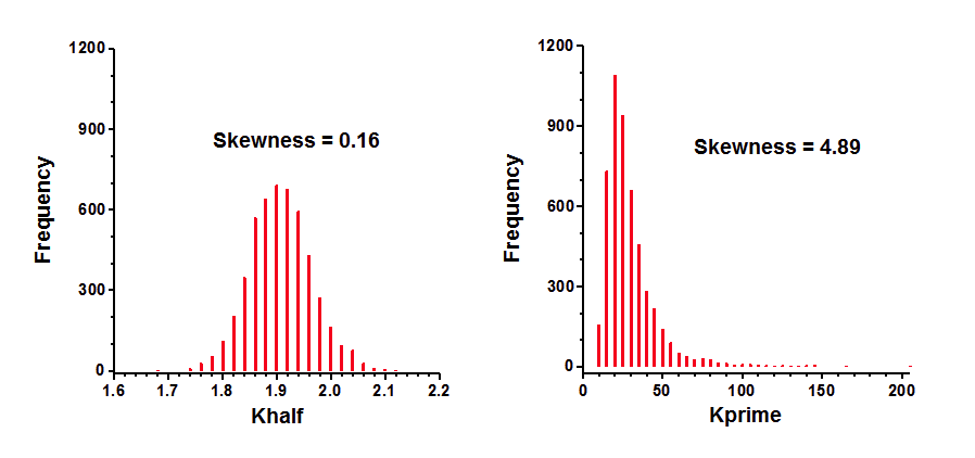The distribution of Khalf is quite symmetrical and looks Gaussian. Accordingly, its skewness is close to zero. In contrast, the distribution of Kprime is quite skewed. Note that a few of the simulation data sets had best-fit values of Kprime greater than 100. The skewness value (4.89) confirms what is obvious by inspection -- the distribution is far from symmetrical.