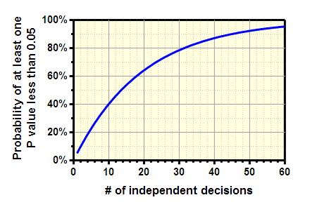 Interpreting multiple P values is difficult. If you test several independent null hypotheses and leave the threshold at 0.05 for each comparison, the chance of obtaining at least one “statistically significant” result is greater than 5% (even if all null hypotheses are true). This graph shows the problem. The probability at least one "significant" comparison is computed from the number of comparisons (N) on the X axis using this equation: 100(1.00 - 0.95N).