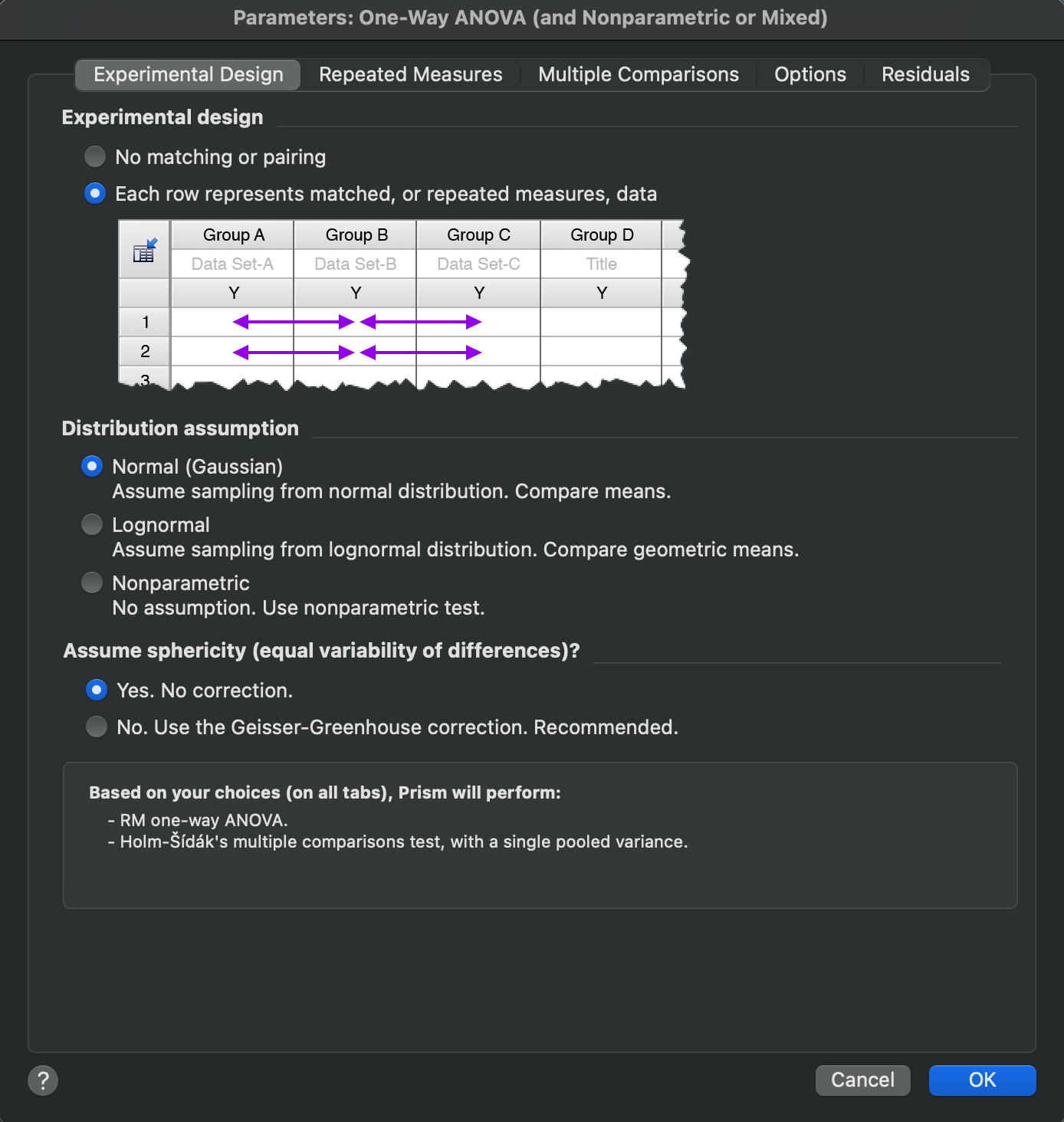 If you ask Prism to assume sphericity, but in fact that assumption is violated, the P value from ANOVA will be too low. For that reason, if you are unsure whether or not to assume sphericity, we recommend that you check the option to not assume sphericity.