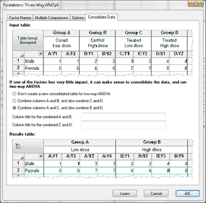 When columns are combined, the values stay the same but there are more subcolumns. So if you choose to combine columns A and B (and C and D), you'll end up with half as many dataset columns, each with twice as many subcolumns. The Y1 subcolumn of column B becomes the Y3 subcolumn of the new column A.