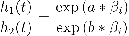 Another very interesting result of this assumption of a baseline hazard function is what happens when we consider the hazard for two individuals with different values of predictor variables. To keep it simple, let’s consider a model with a single predictor variable (xi), in which one individual has a value of “a” for this variable, and the second individual has a value of “b” for this variable. The hazard functions for these two individuals would be: