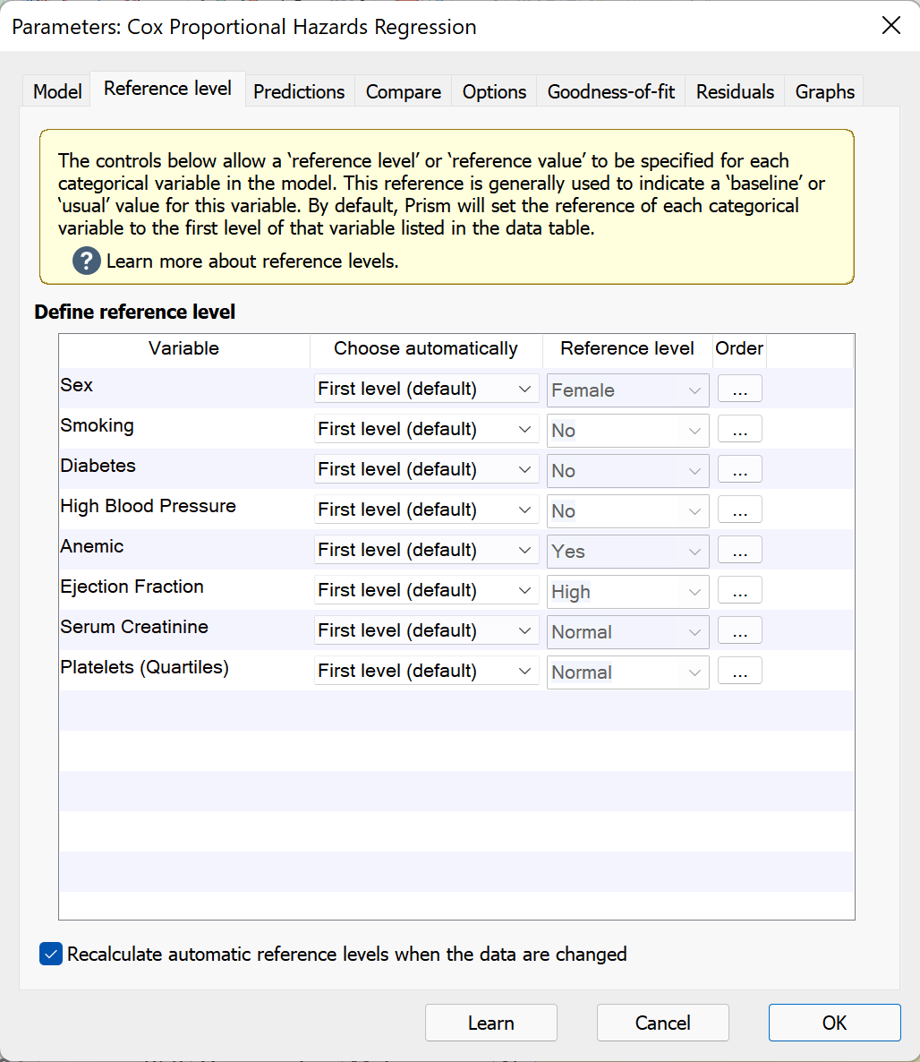 By default, the reference level for a categorical variable is selected to be the first level of that variable in the data table. Prism also offers other automatic choices including "Last level", "Most frequent level", and "Least frequent level". However, if the input data are changed (or if additional data are added to the input data table), some of these automatic choices may also change. To ensure that a specified reference level does not change when the input data are changed or additional data is added, either uncheck the box beside "Recalculate automatic reference levels when the data is changed" or set the individual reference levels to "Custom..." using the appropriate dropdown menu.