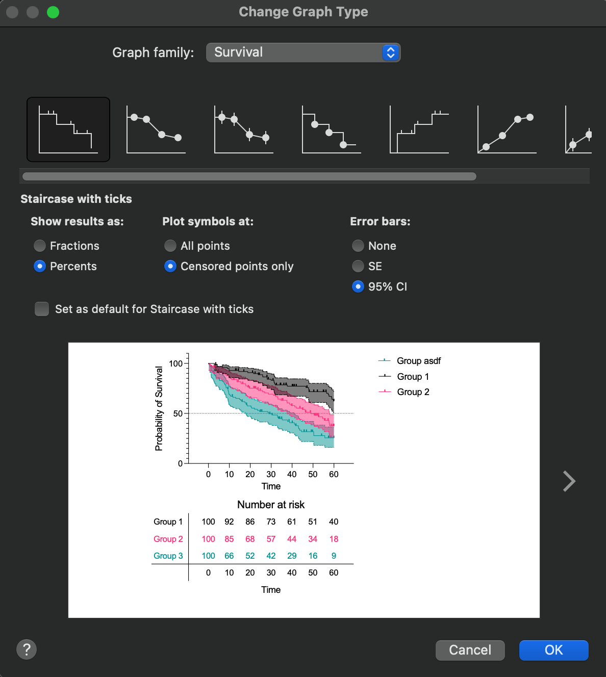 Prism will automatically analyze data entered into a survival data table, and will prepare a graph of the resulting Kaplan-Meier survival curves. When you first navigate to the graph, you will be presented with a dialog that provides some basic options for graph customization. Most of these options are self-explanatory.