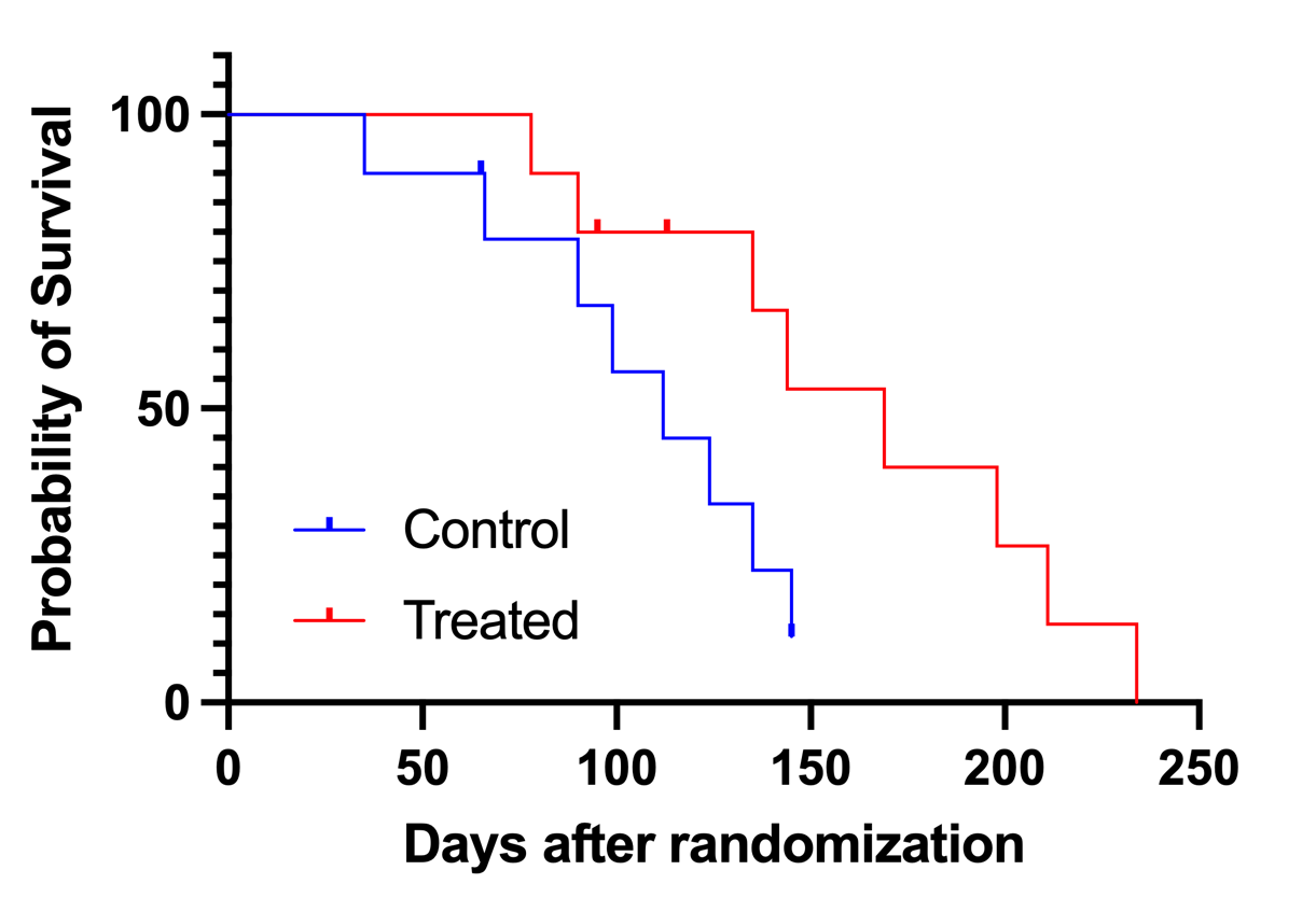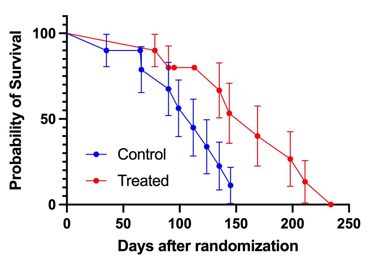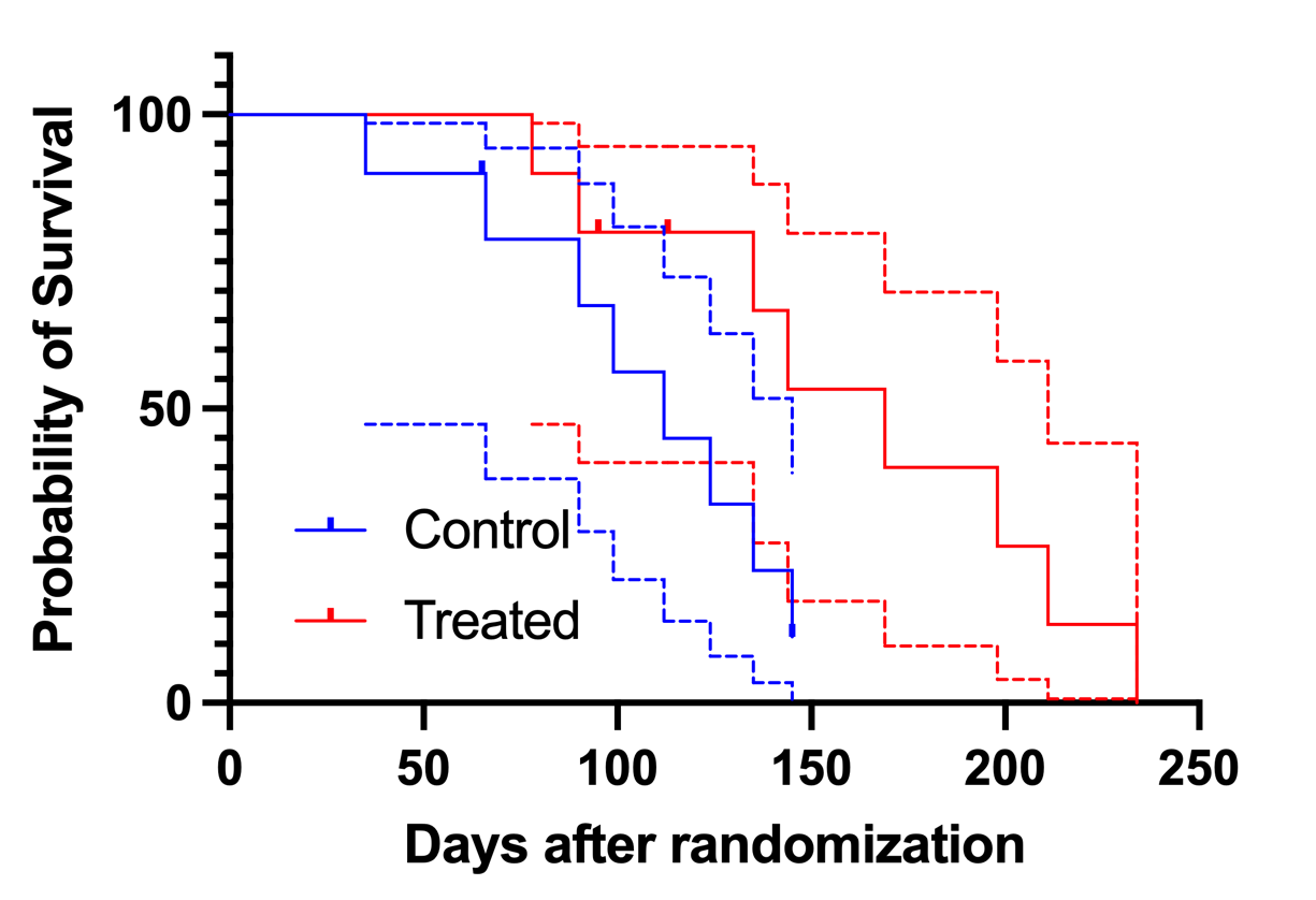In the left graph below, the elapsed observation time is plotted on the curve as a tick. Symbols for both events and censored observations are plotted, but the ticks for the events are “hidden” by the vertical portions of the curve. Censored observations can be clearly seen as ticks along the horizontal portion of the curve. These data include two observations in the treated group between the times of 100 and 150 days.