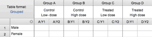 5. On the third (Factor Names) tab, optionally name the grouping variables that define the rows and columns. For the example shown above, A&B vs C&D could be named "treatment"; A&C vs. B&D could be named "dose", the rows could be named "sex".