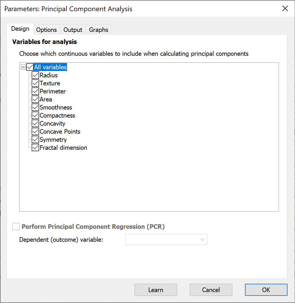 Choose at least two continuous variables to include in the PCA. Categorical variables cannot be analyzed using PCA. Remember that with PCA you don’t need to designate a response, or Y, variable. If you plan to run Principal Components Regression, do NOT select the dependent (outcome) variable when choosing variables for analysis.