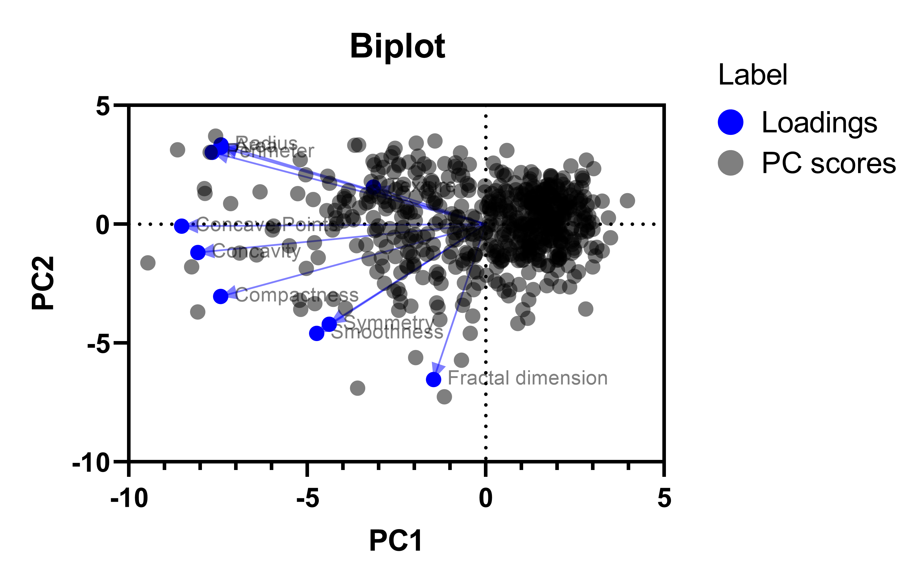 In the plot below from the breast cancer sample data included in Prism, we see that all the columns appear on the left hand side. That means that the first principal component has a negative value for all the loadings. The negative value has no interpretation, but because all the variables are on one side means that each variable correlates with the first PC in the same direction, namely as the variable goes up, the PC1 score goes down.