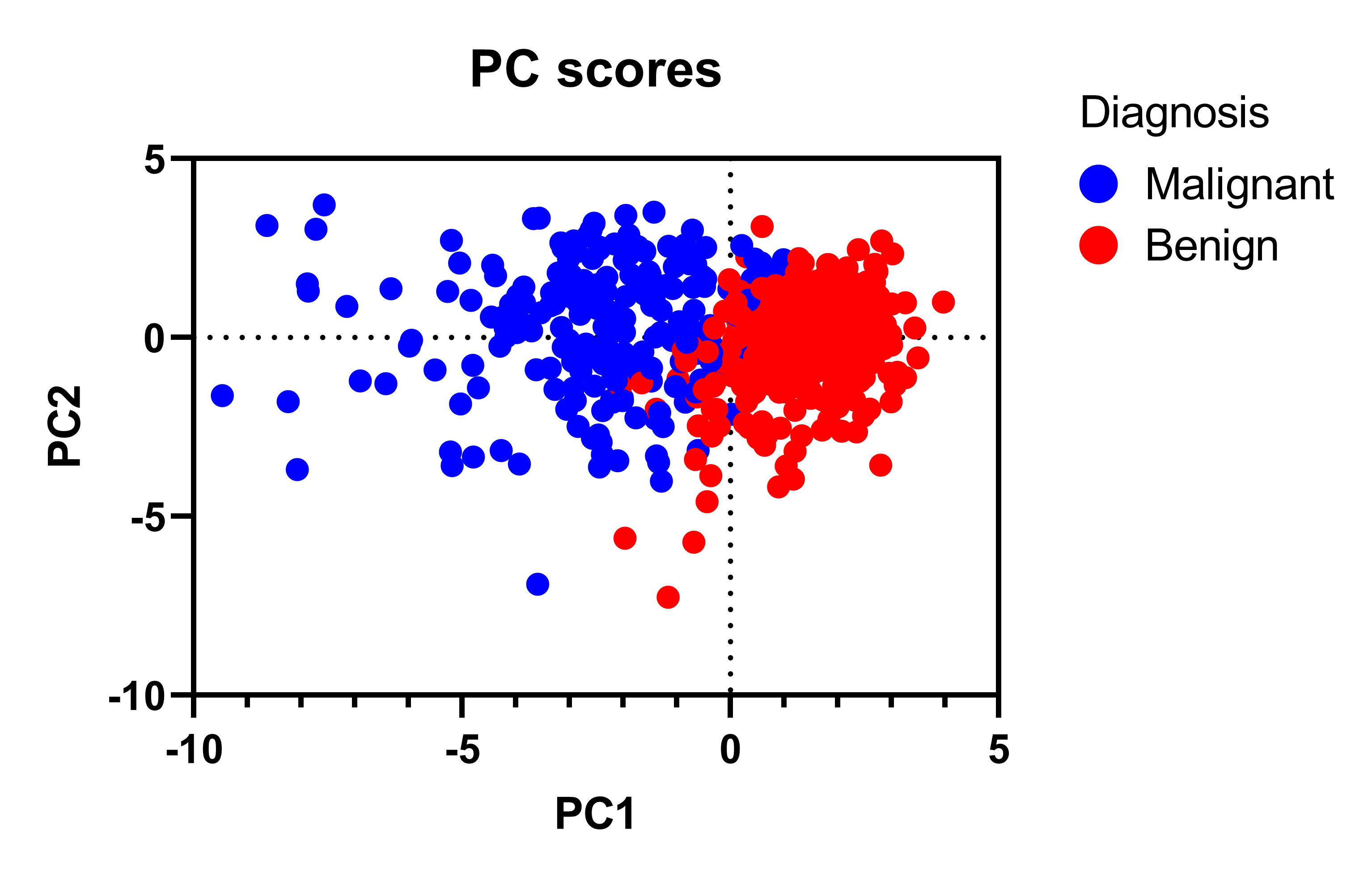 PC scores are used to plot the rows of your data along the chosen principal component axes. These plots offer a low dimension representation of your data. It’s primarily useful for clustering or deriving some other meaning based on where certain points appear in relation to the others along the two selected components. In Prism, you can hover your cursor over points of interest to get links to that associated row or column in the data table.