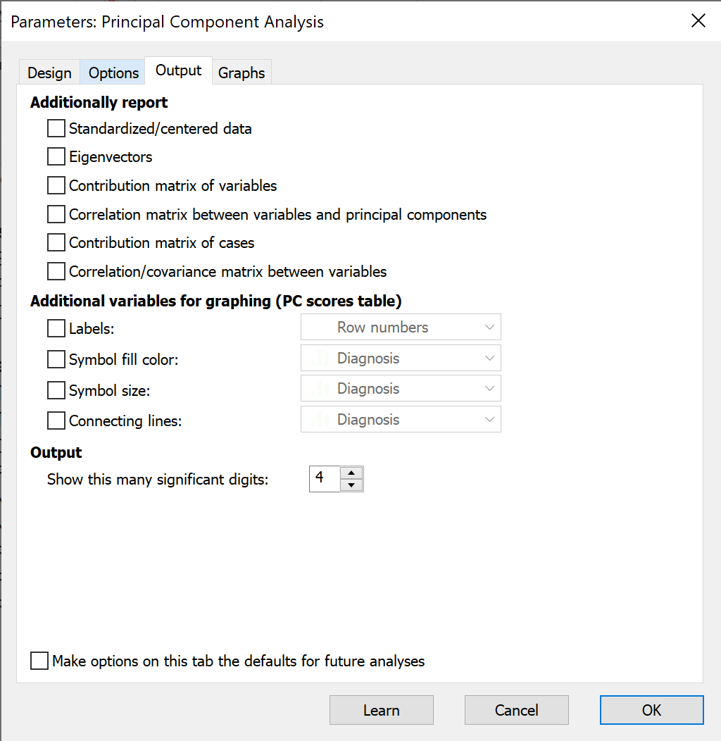 In this tab, you can customize the output from PCA and define additional variables to include in the results tables. These additional variables can be used for graphing and subsequent analyses.