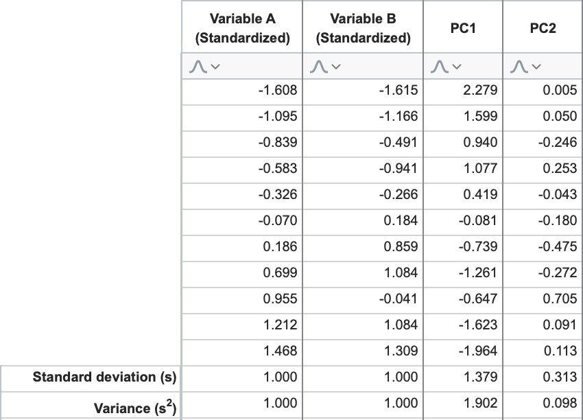 If you calculate the standard deviation for the columns “PC1 Scores” and “PC2 Scores”, and then square those values (variance = [standard deviation]2), you get… you guessed it: 1.902 and 0.098, respectively.