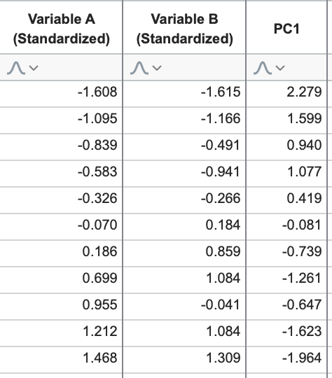 With this formula, we now have a way to approximate (“reconstruct”) the original data using a smaller number of variables (in this case, reducing only from two variables down to one). The following table shows the resulting values when plugging in the values of Variable A and B into this equation: