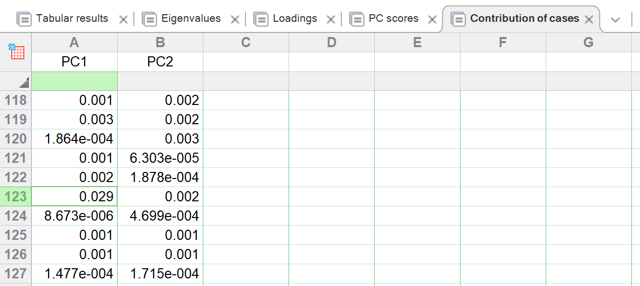 Analogous to the contribution matrix of variables, the contribution matrix of cases indicates which rows contribute to the PCs relative to the other rows. Each row represents one case (row in the original data table), and each column represents one PC. Note that only PCs that were selected by the chosen selection method are displayed in this table.