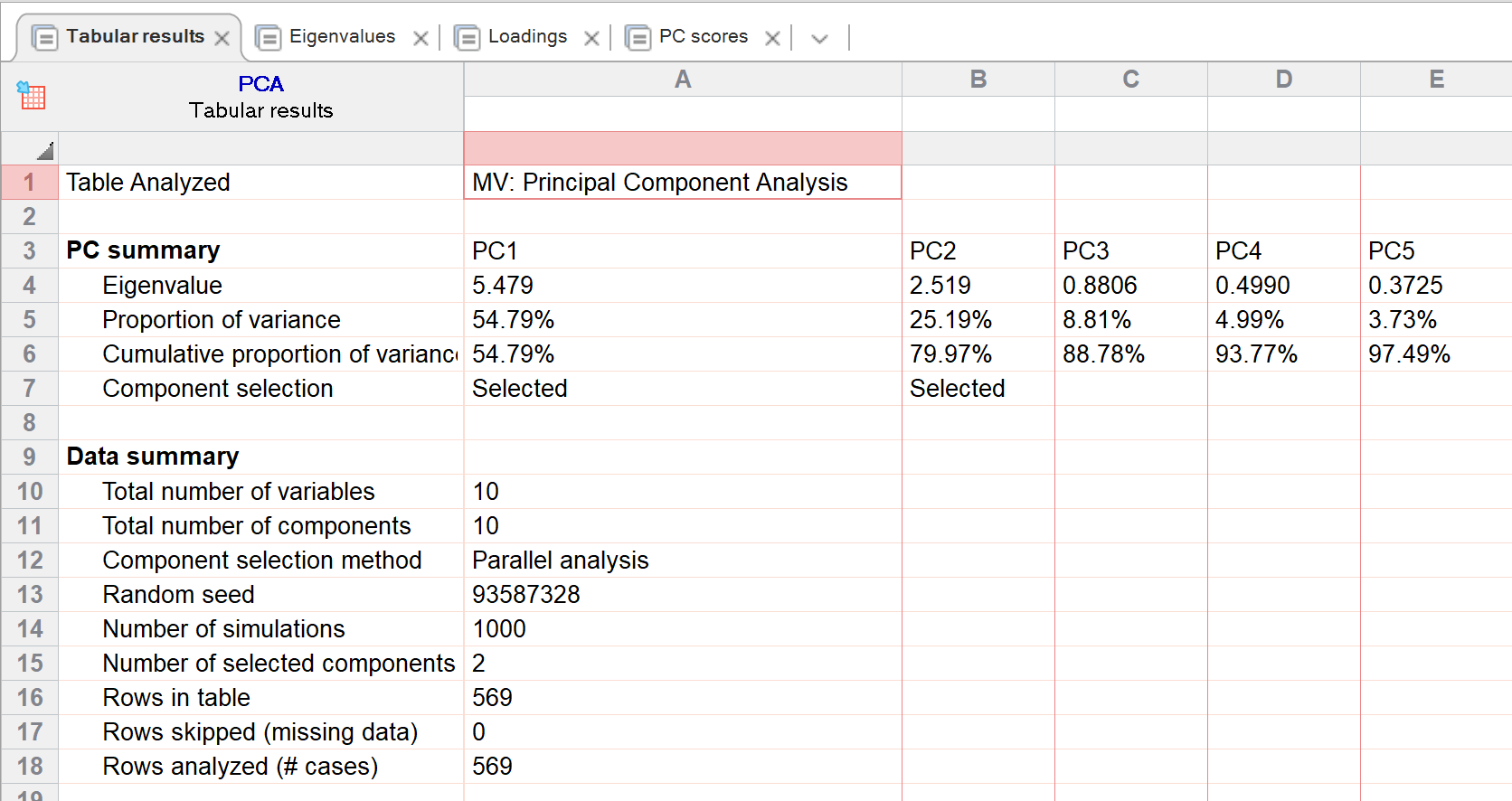 Tabular results provide a snapshot of the analysis, including the eigenvalues, proportion of variance explained, and the number of selected components. All Principal Components are included in this table even if only some components were selected.