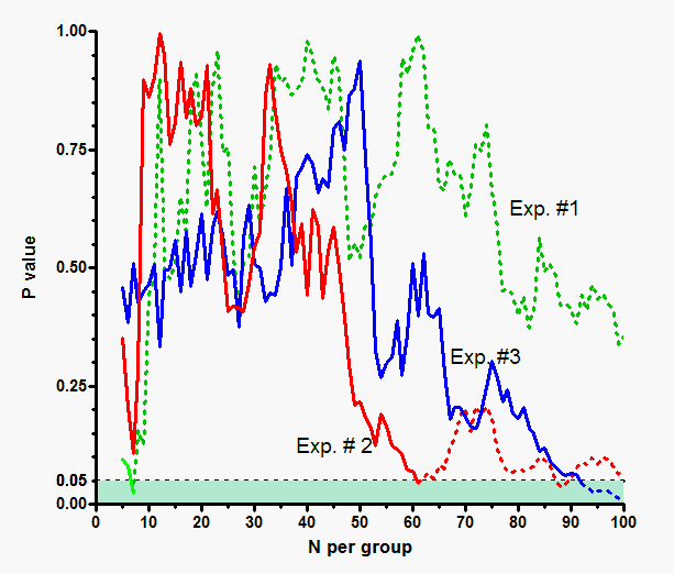 Experiment 1 (green) reached a P value less than 0.05 when N=7, but the P value is higher than 0.05 for all other sample sizes. Experiment 2 (red) reached a P value less than 0.05 when N=61 and also when N=88 or 89. Experiment 3 (blue) curve hit a P value less than 0.05 when N=92 to N=100.